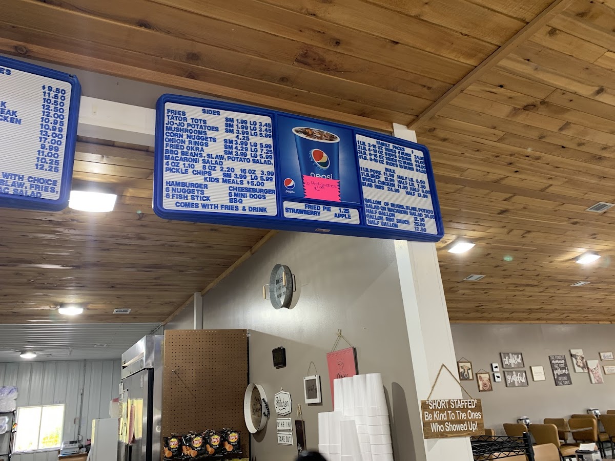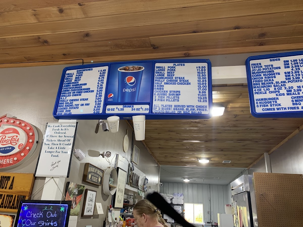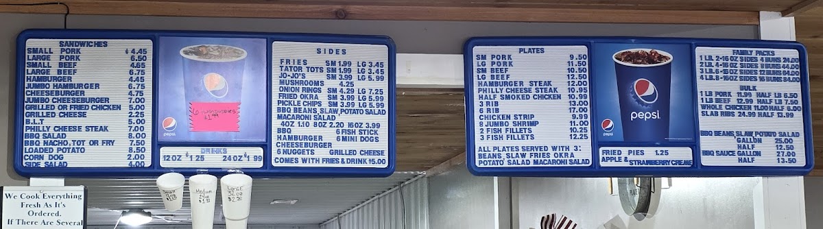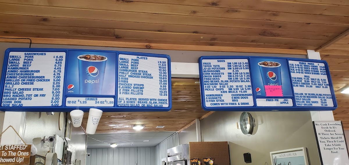 Expect to find comforting offerings such as pulled pork sandwiches paired with crispy fries, generous ribs with two sides, and juicy cheeseburgers available in regular and jumbo sizes. Plates featuring half smoked chicken or hearty portions of ribs create a filling, down-to-earth dining experience. Sides like fried okra, homemade onion rings, and classic cole slaw complement the main dishes with familiar, well-loved flavors.